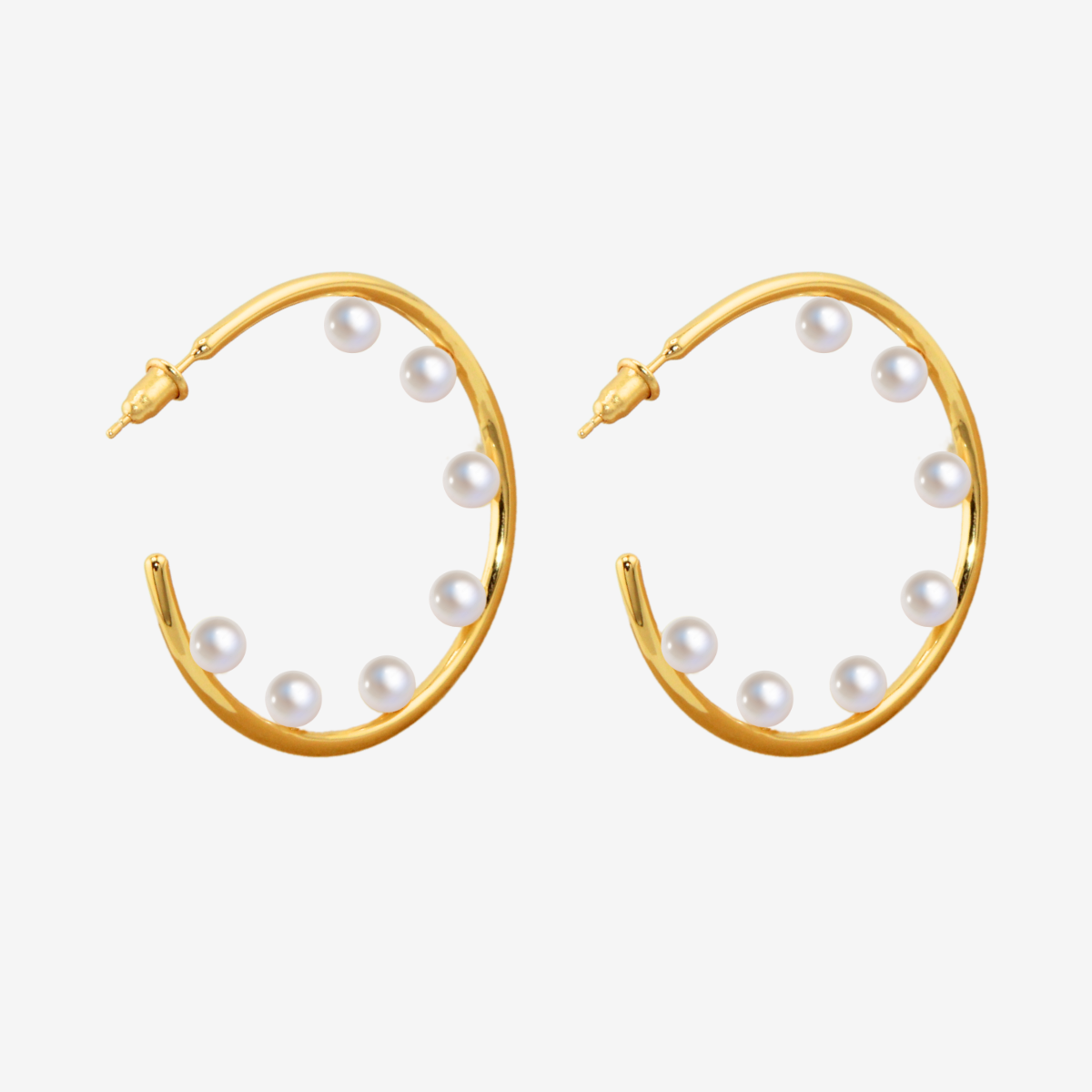フープの内側にリズミカルに並んだ小粒のパール。正面はミニマルに、横顔は印象的に。