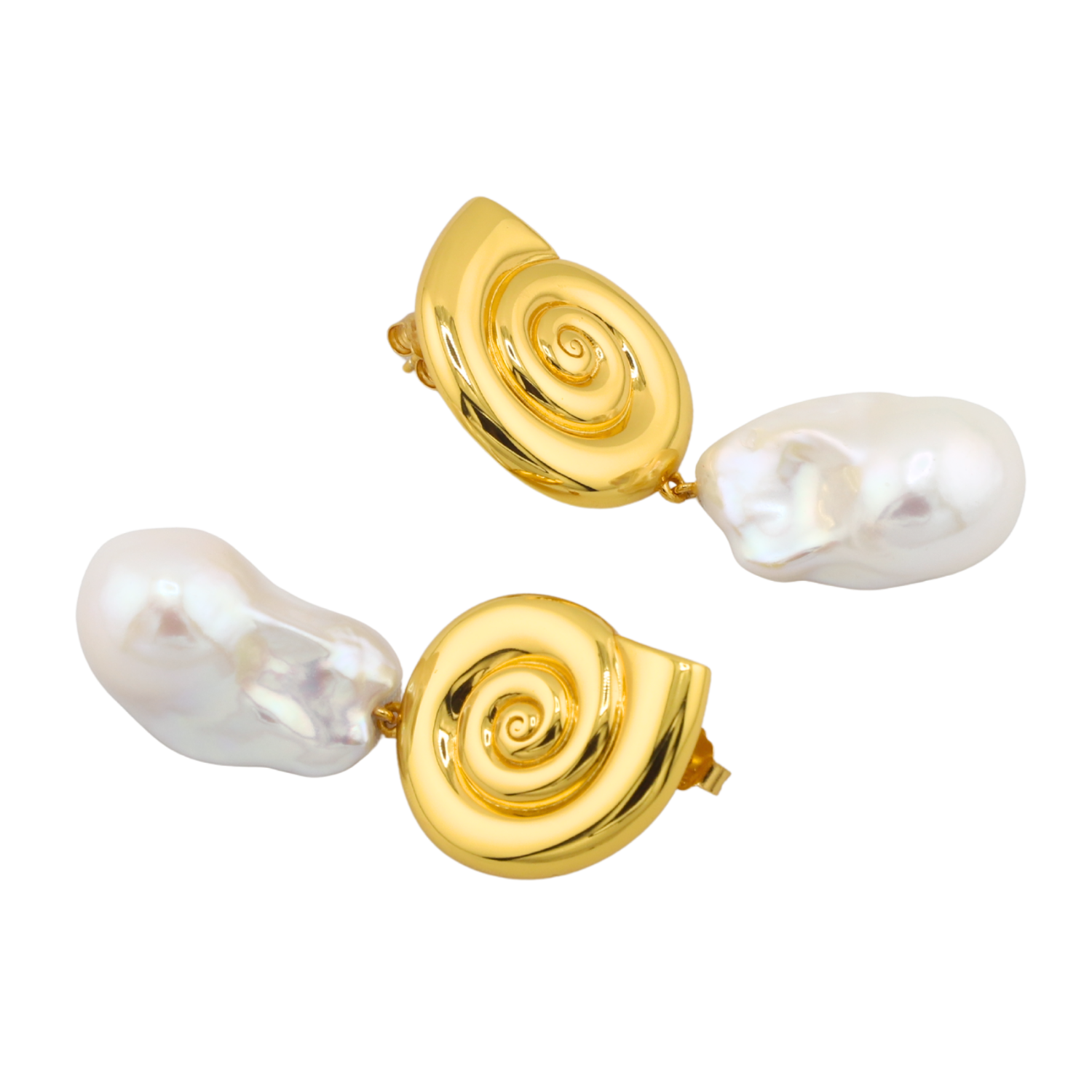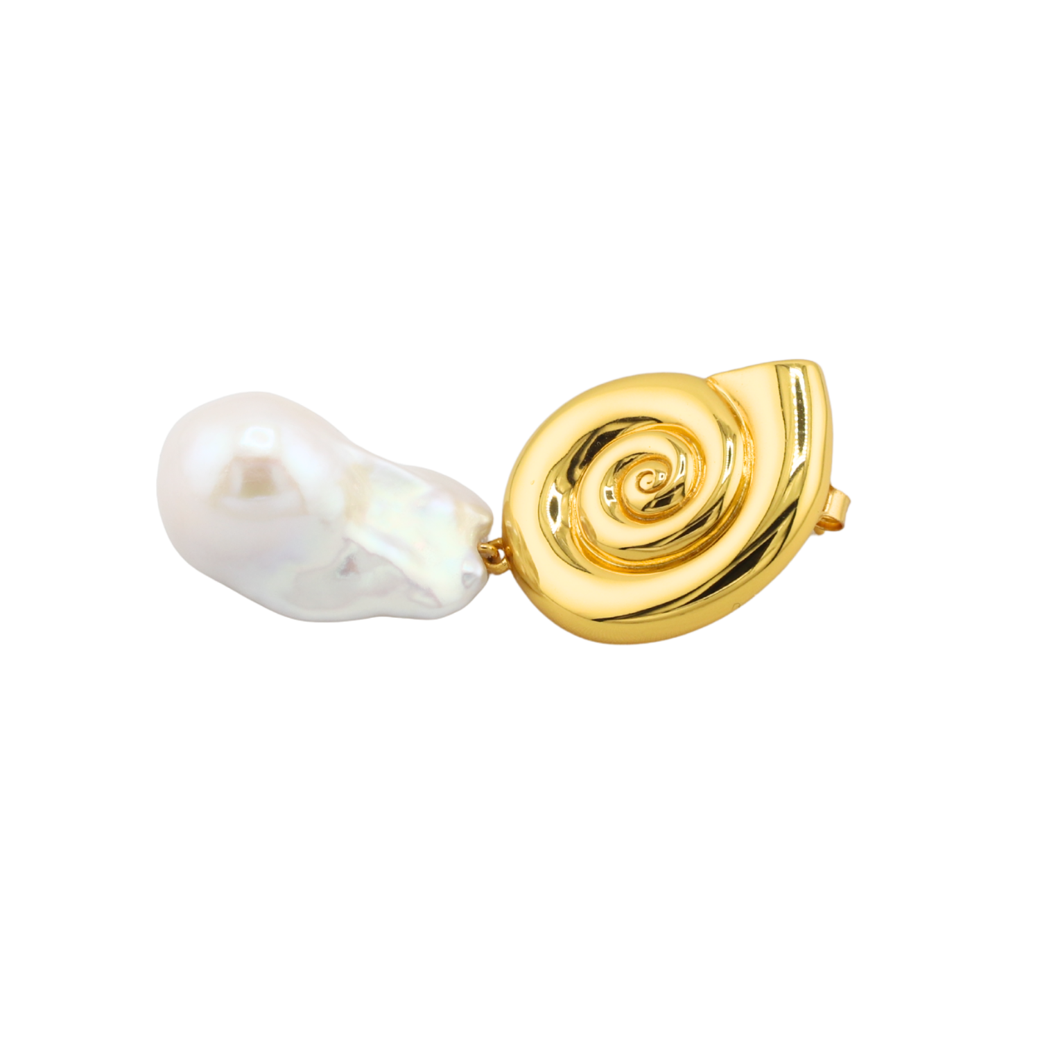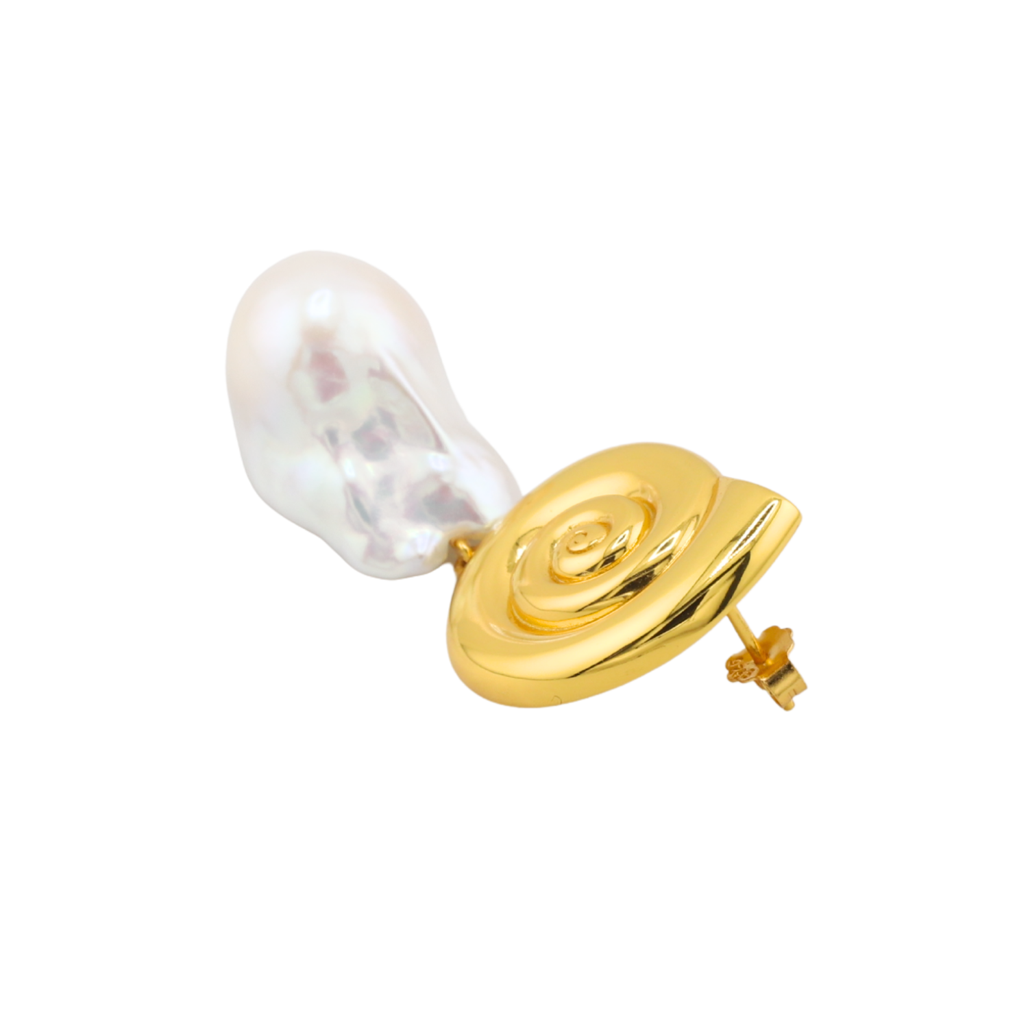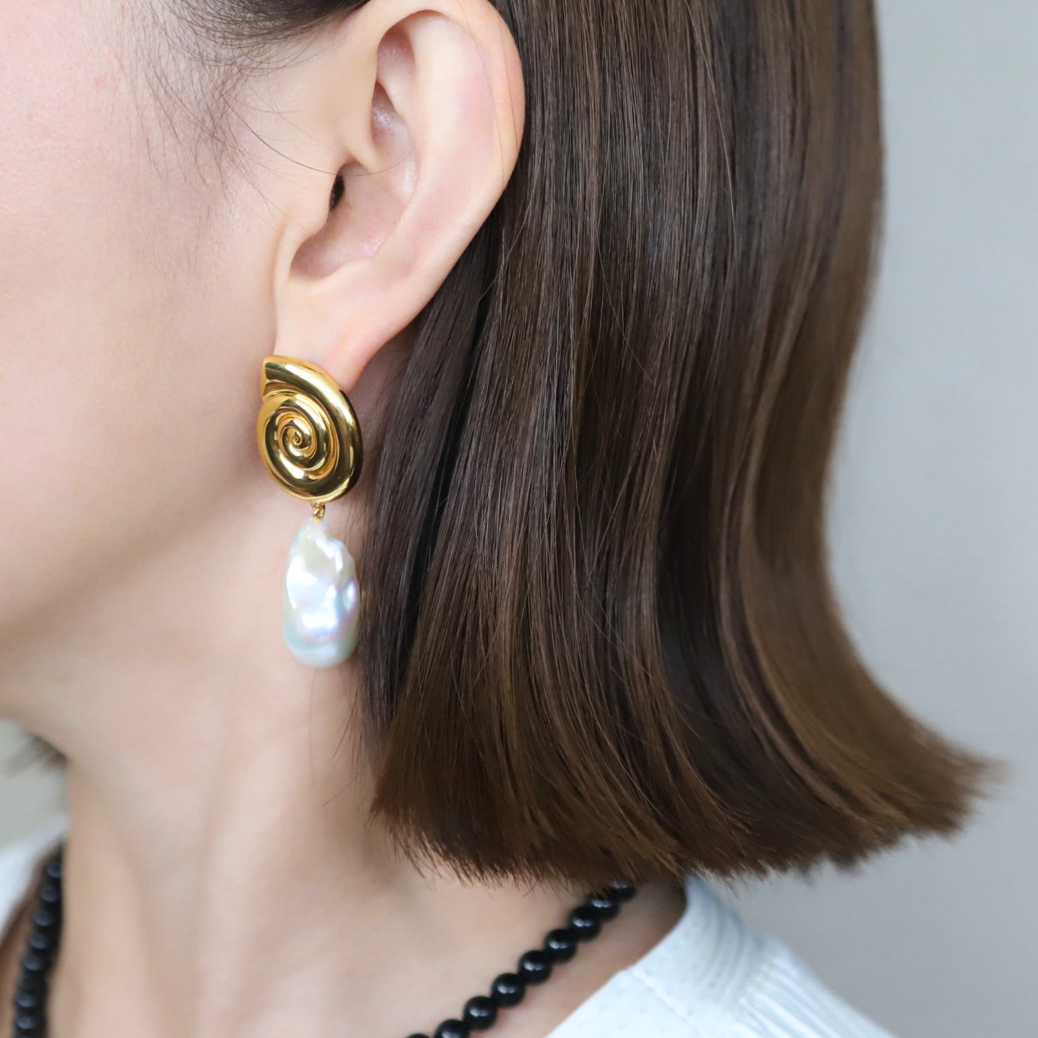 螺旋を描くシェルモチーフと唯一無二のバロックパールを組み合わせた存在感あふれるピアス。光沢感のあるメタル部分は渦巻きのようなデザインで、生命の循環やエネルギーを思わせるモチーフ。揺れるバロックパールは、一粒ごとに異なるフォルムと艶を持ち、自然が生み出す造形美をそのまま纏うことができます。