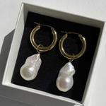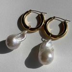 重厚感のある太めのフープに、照りの美しい大粒バロックパールをあしらい、存在感と上品さを兼ね備えたデザインに仕上げました。パールチャームは取り外し可能で、シンプルなフープピアスとしてもお使いいただけます。さらに、パールをお手持ちのチェーンに通せばネックレスとしてもアレンジ可能。