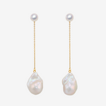 チェーンの先端にあしらわれたバロックパールが、華やかなアクセントを添えるロングピアス。縦に伸びるロングシルエットが顔周りをすっきりと引き締め、女性らしい上品な印象を演出します。