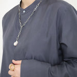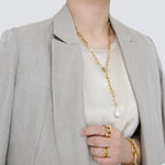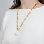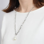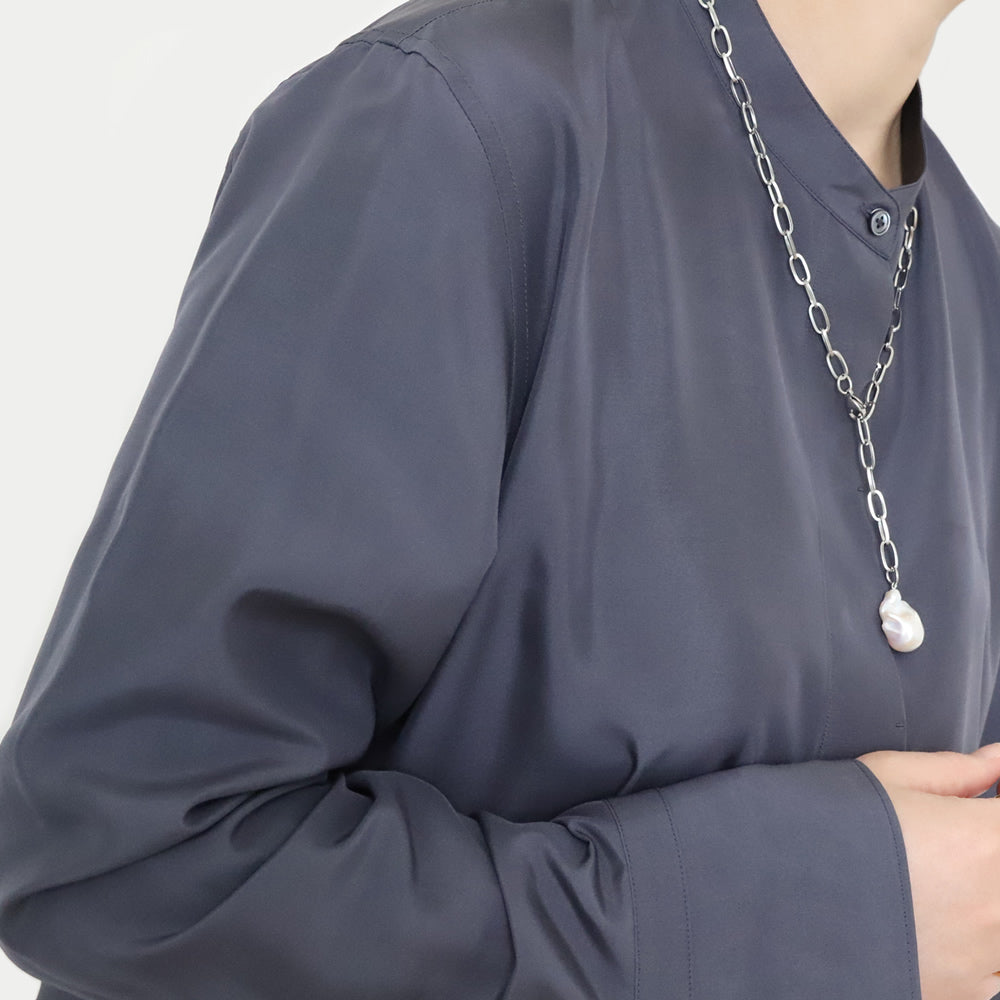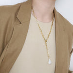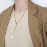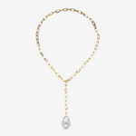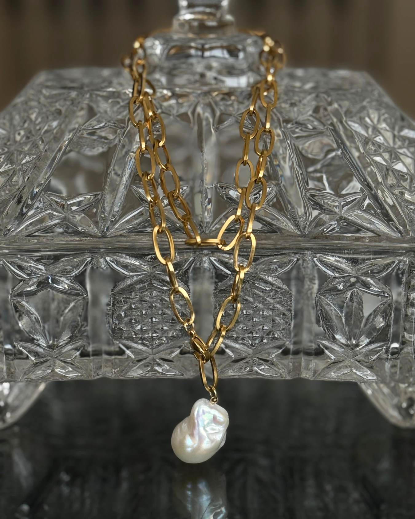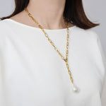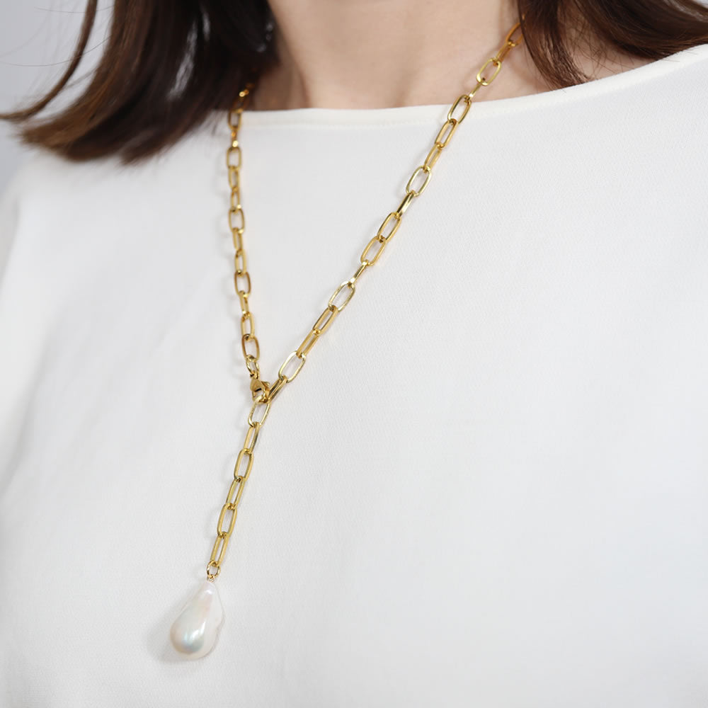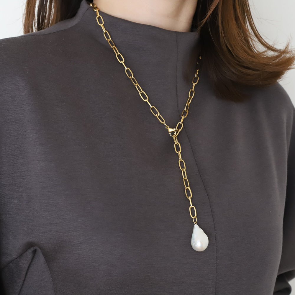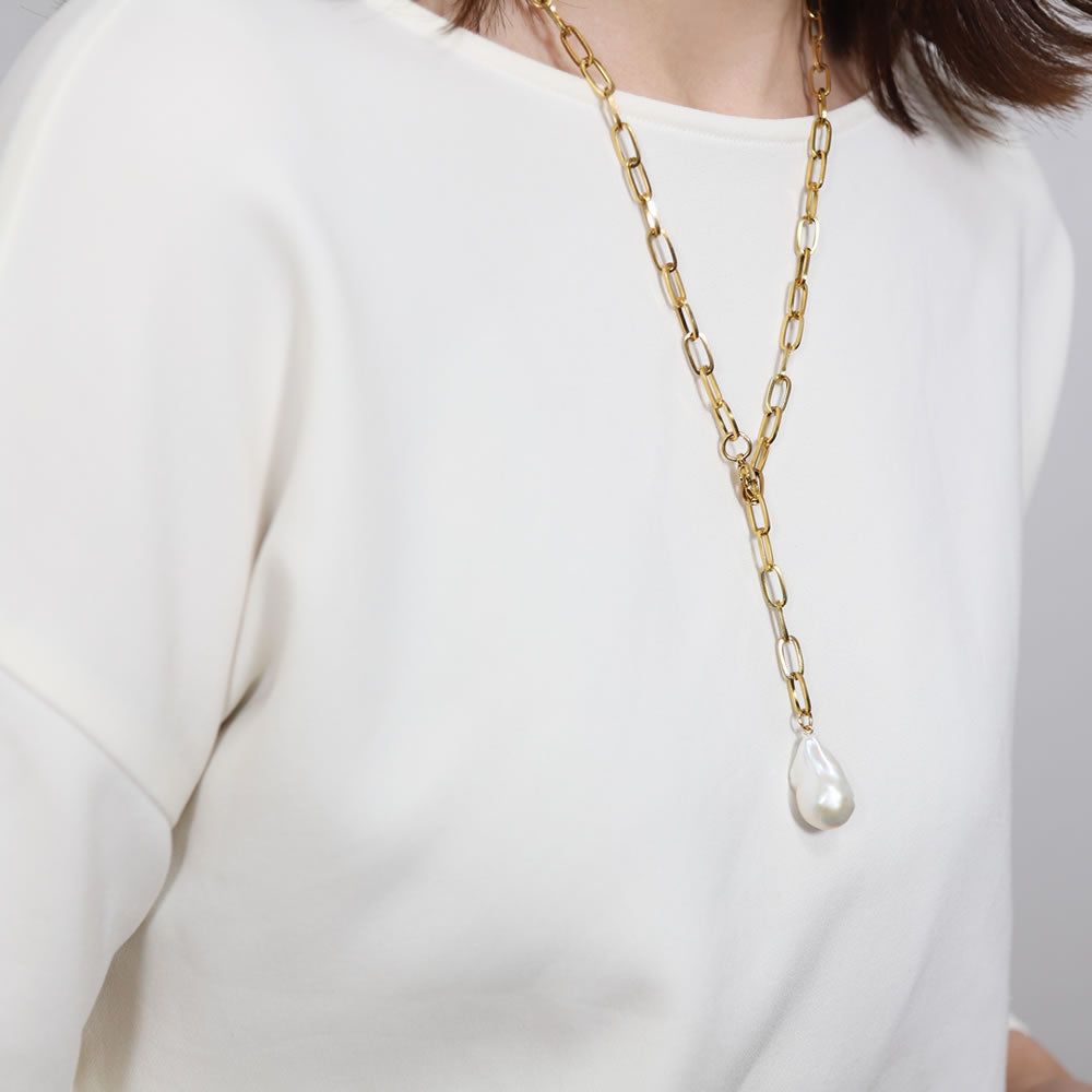 デコルテがスッキリ見えるデザインで、チェーンは好きな位置で留められるので、長さ調節が自由自在。軽やかに揺れるバロックパールが、あなたの魅力をより一層引き立てます。