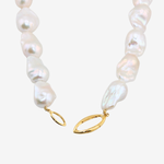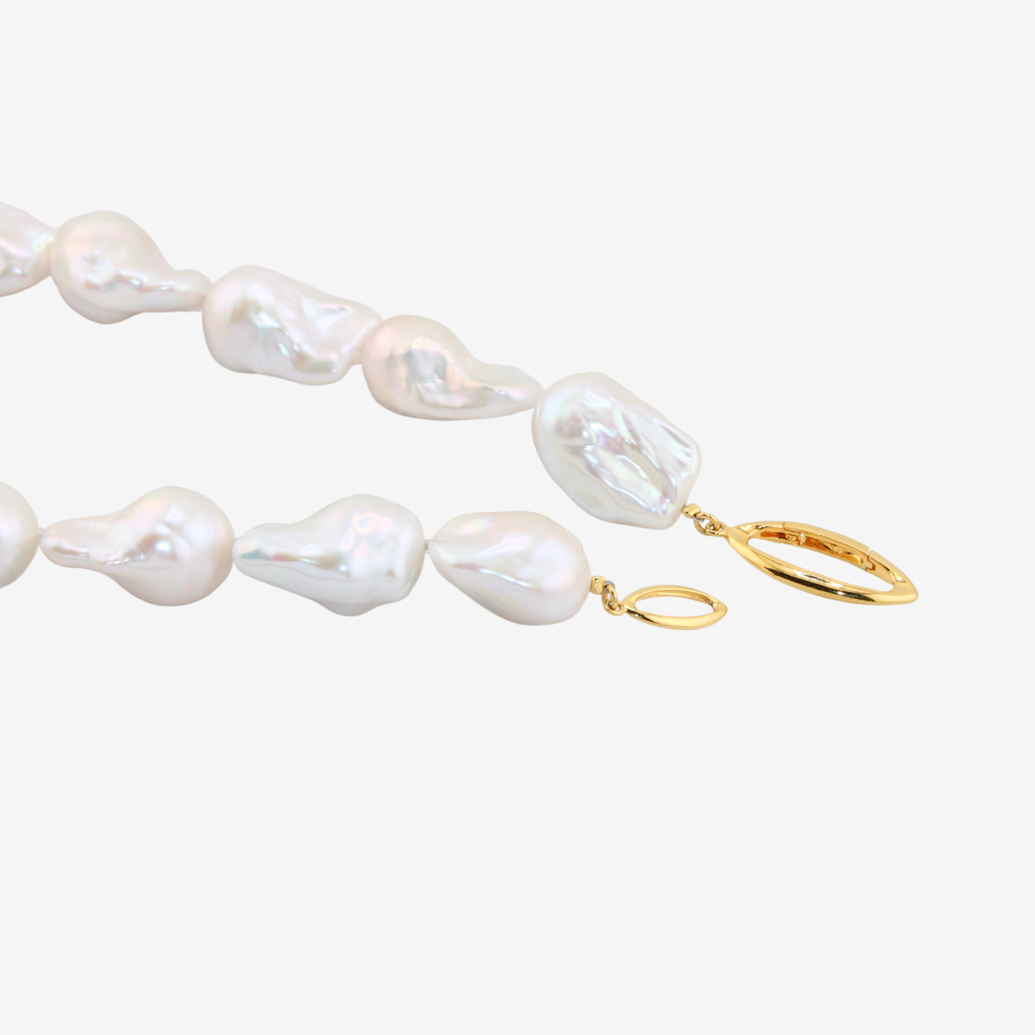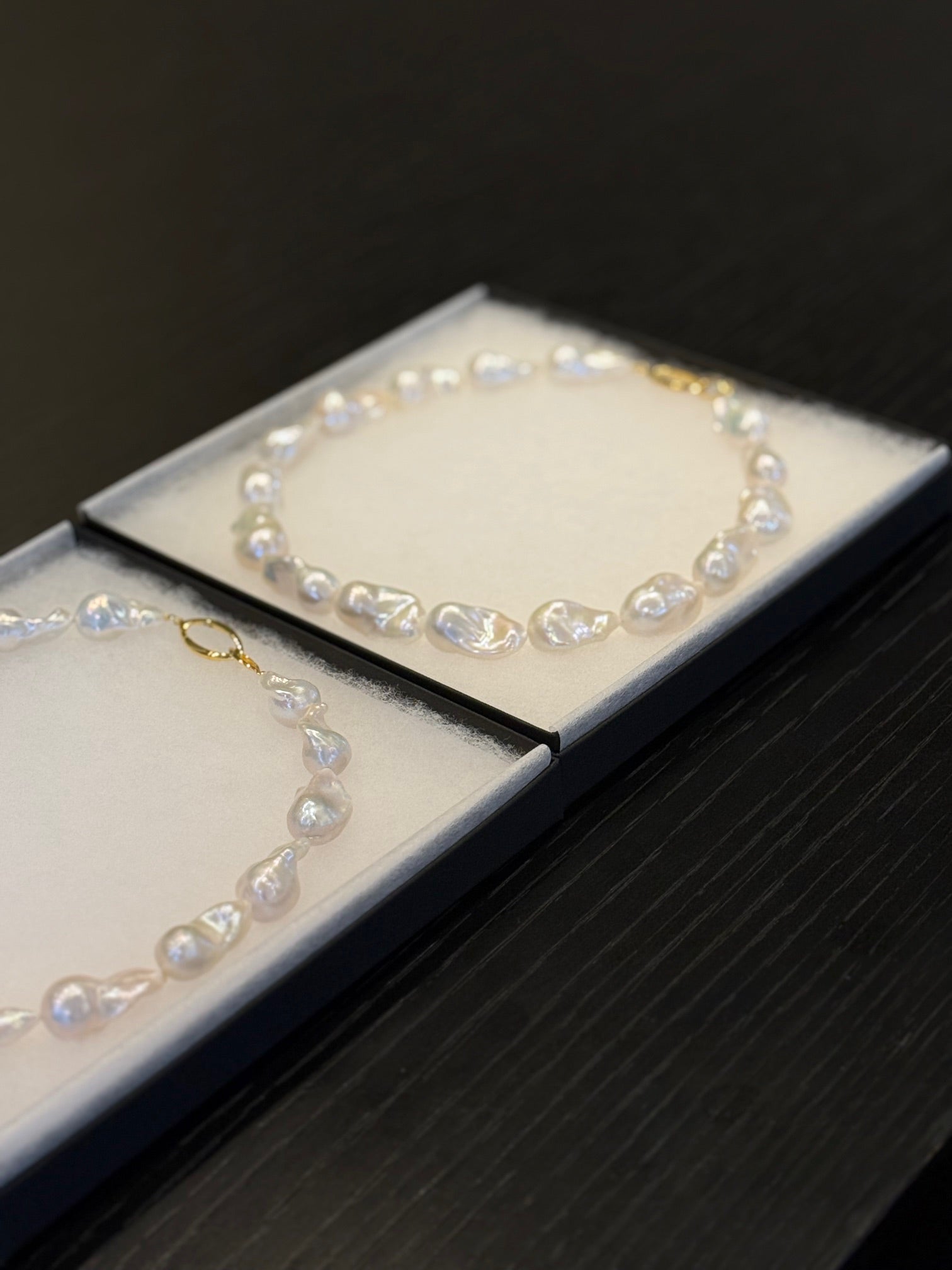真珠の生産者が、LARICAのために特別に選び、組んでくれた、Sクラスのバロックパールを贅沢に使用した一本。ひと粒ごとに異なるフォルムと強いテリが放つ、唯一無二の存在感。