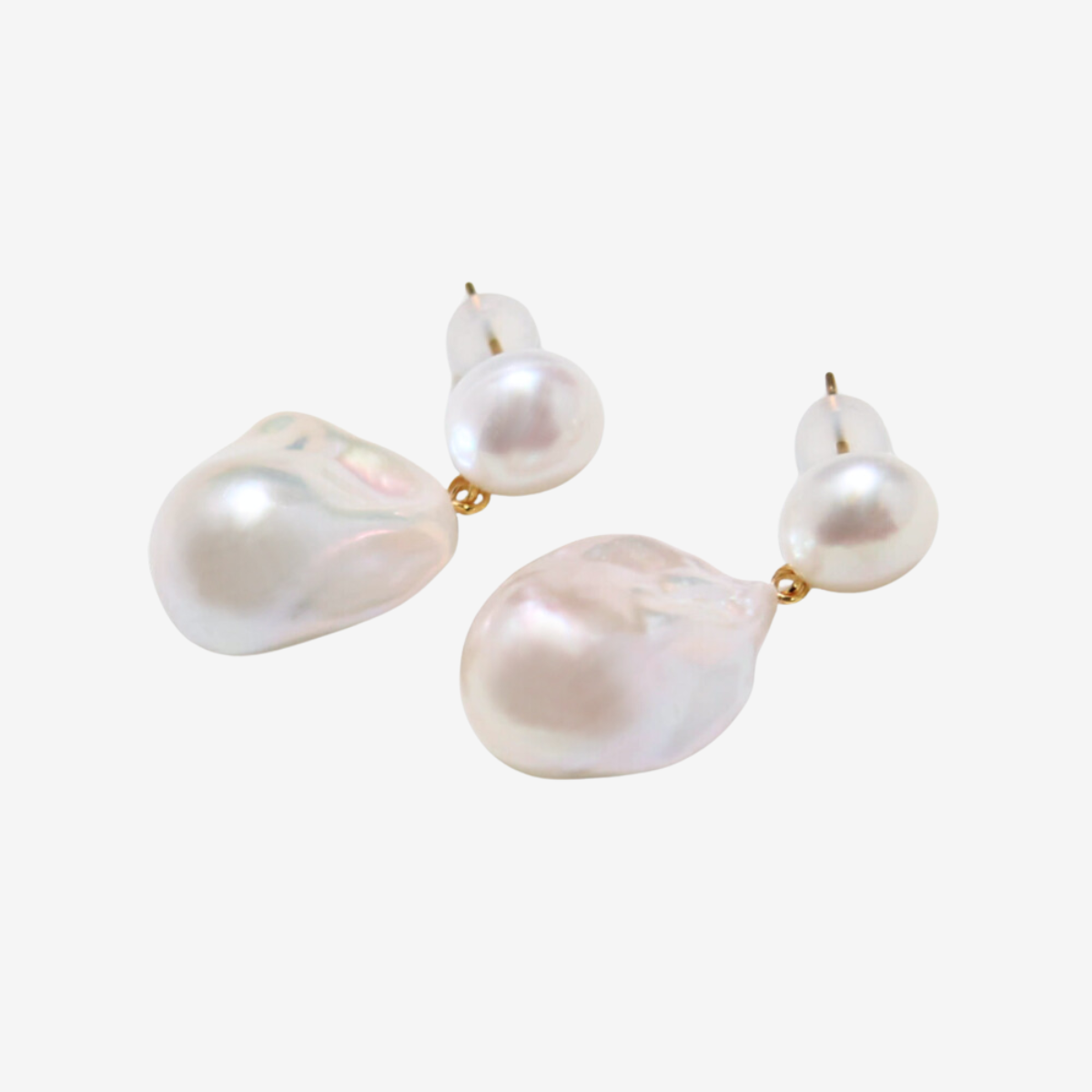 異なるフォルムの淡水パールを組み合わせたバロックパールピアス・イヤリング。