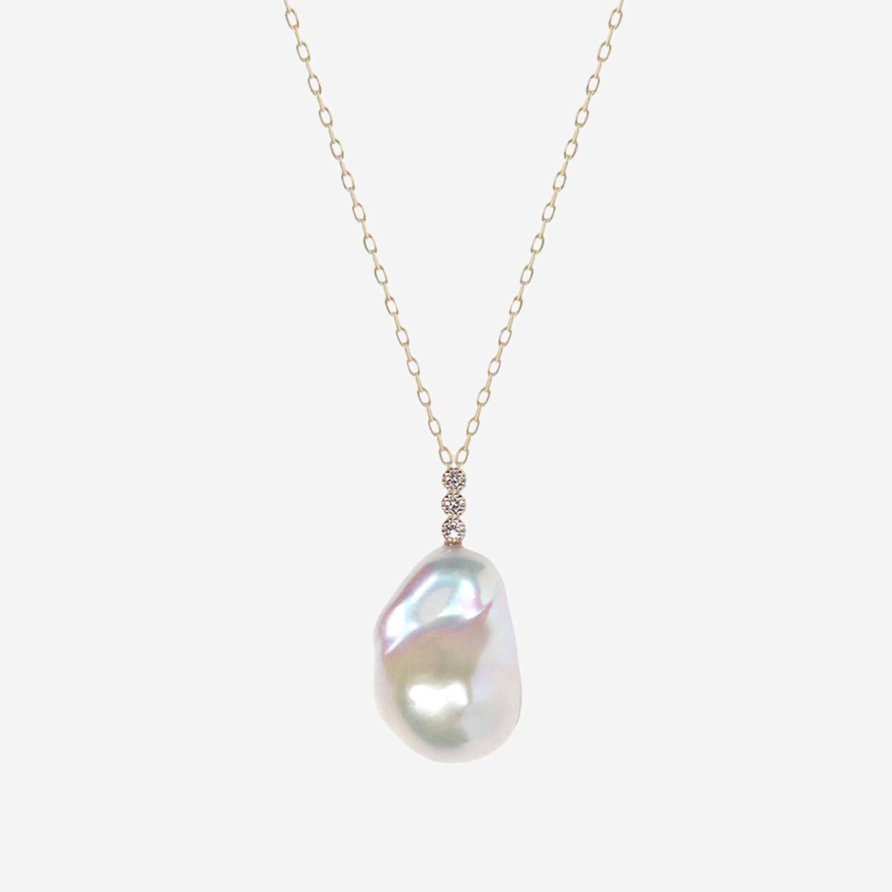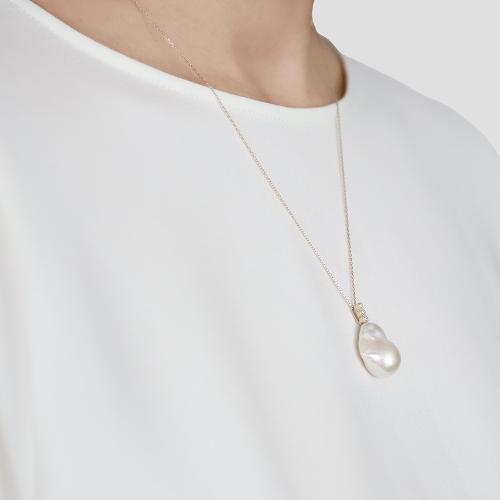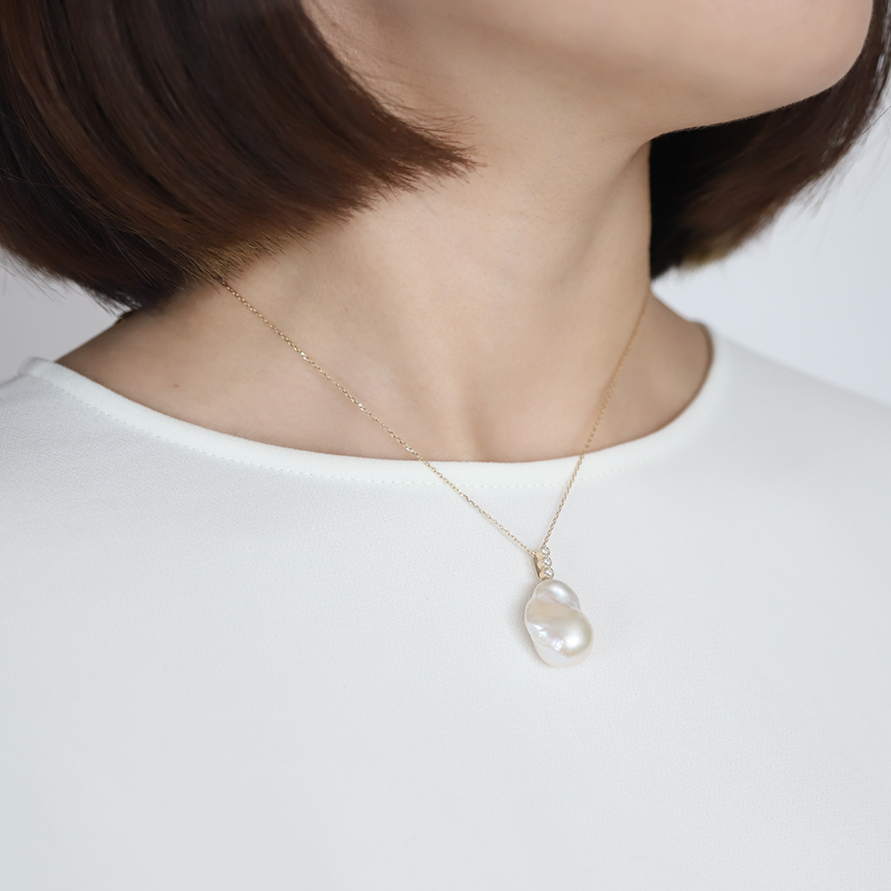 美しいバロックパールと美しいダイヤモンドが光る、贅沢なネックレス。自然が生み出す唯一無二のバロックパールに天然ダイヤモンドを縦に3粒あしらったネックレスは、華やかさと上品さを備えたデザインは、上品でどんなシーンでも活躍してくれます。