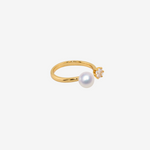 パールとジルコニアが織りなす、上品で華やかなフォークリング。艶やかな光を放つパールと、ブリリアントカットが施されたジルコニアの繊細な輝きが、指先に洗練された存在感を与えてくれます。
