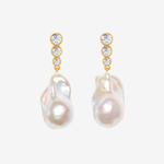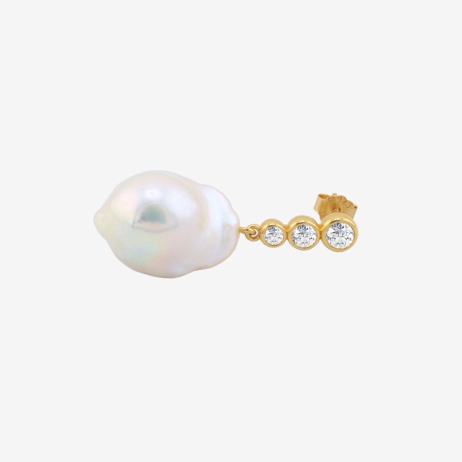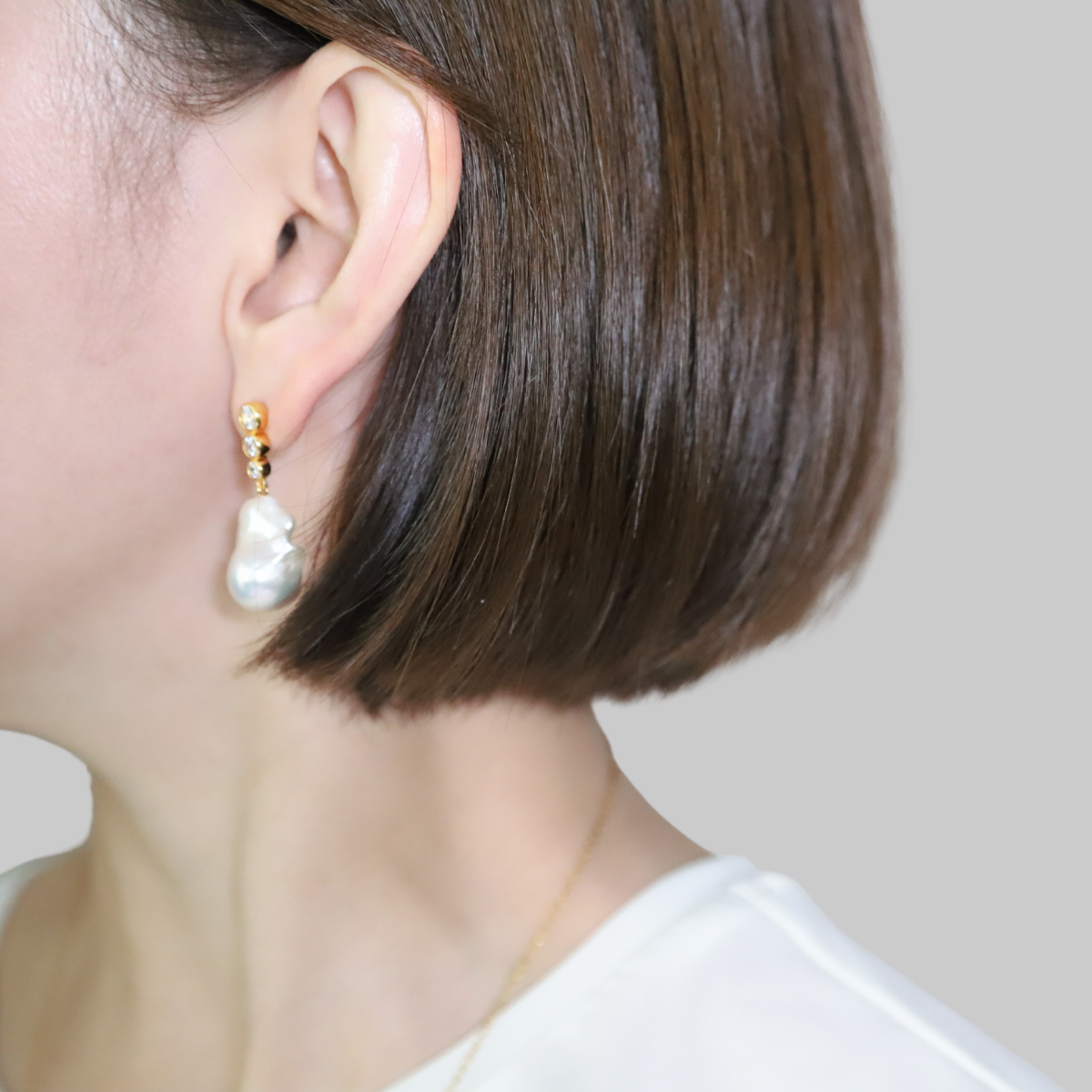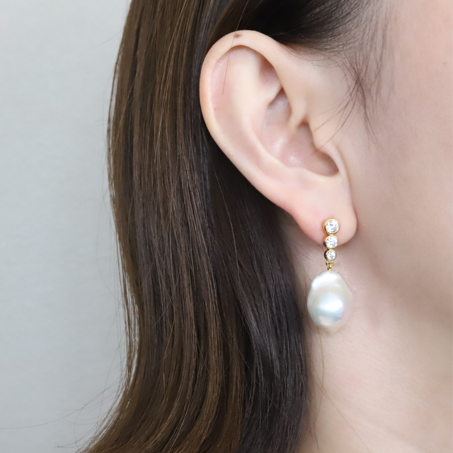 上質な淡水バロックパールに、サイズが異なる3粒のジルコニアをあしらったドロップピアス。ジルコニアの透明感のある輝きが、バロックパールの柔らかな光沢を引き立て、上品さの中に華やかさを添えます。