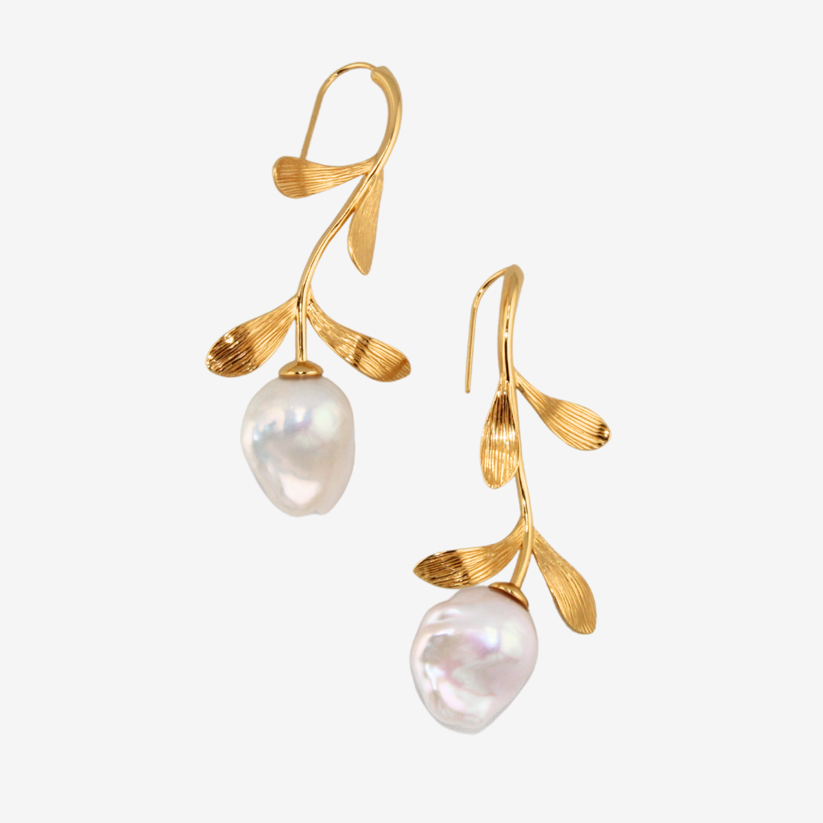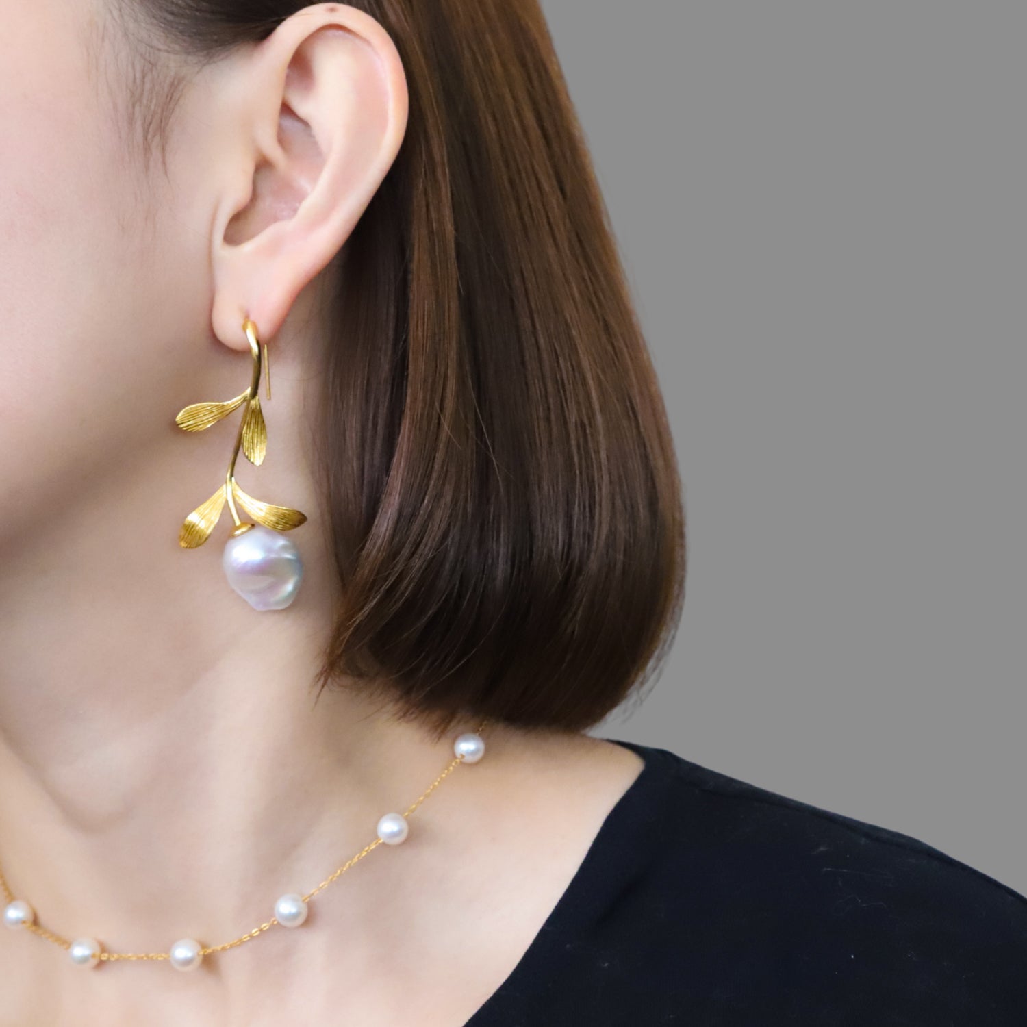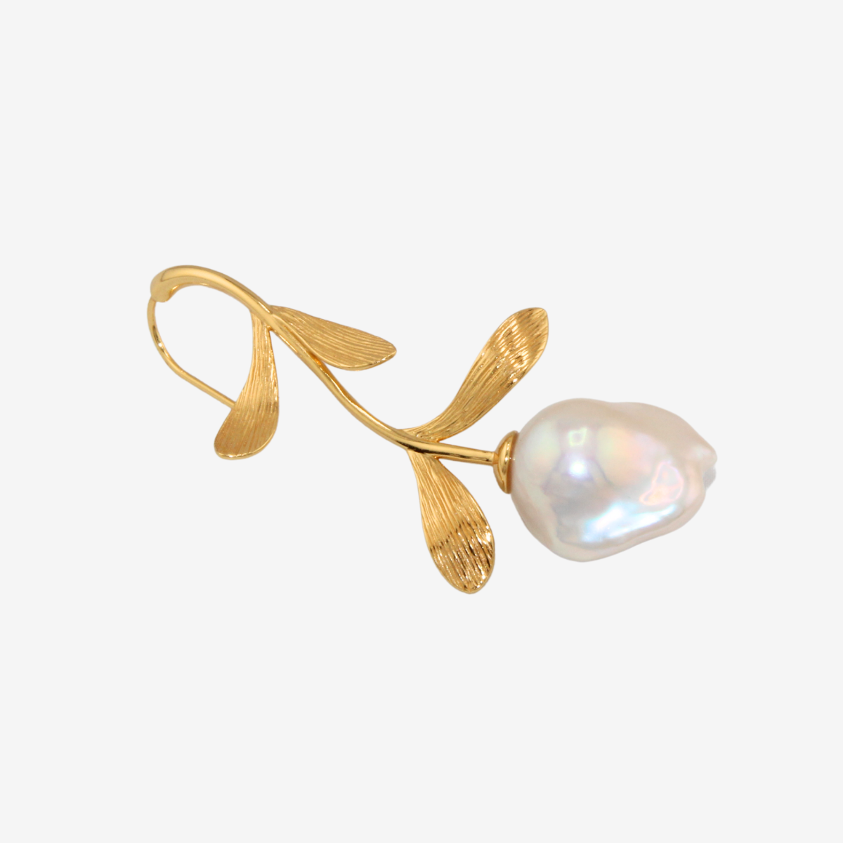 繊細なリーフモチーフの枝先に、自然が育んだ唯一無二のバロックパール。蕾のように、お花のように、耳元で静かに存在を放ちます。立体的に彫刻された葉は、柔らかな曲線と陰影で表情豊かに。艶やかなゴールドの輝きと、パールの温もりが調和し、上品さと個性を兼ね備えた仕上がりです。