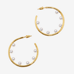 フープの内側にリズミカルに並んだ小粒のパール。正面はミニマルに、横顔は印象的に。