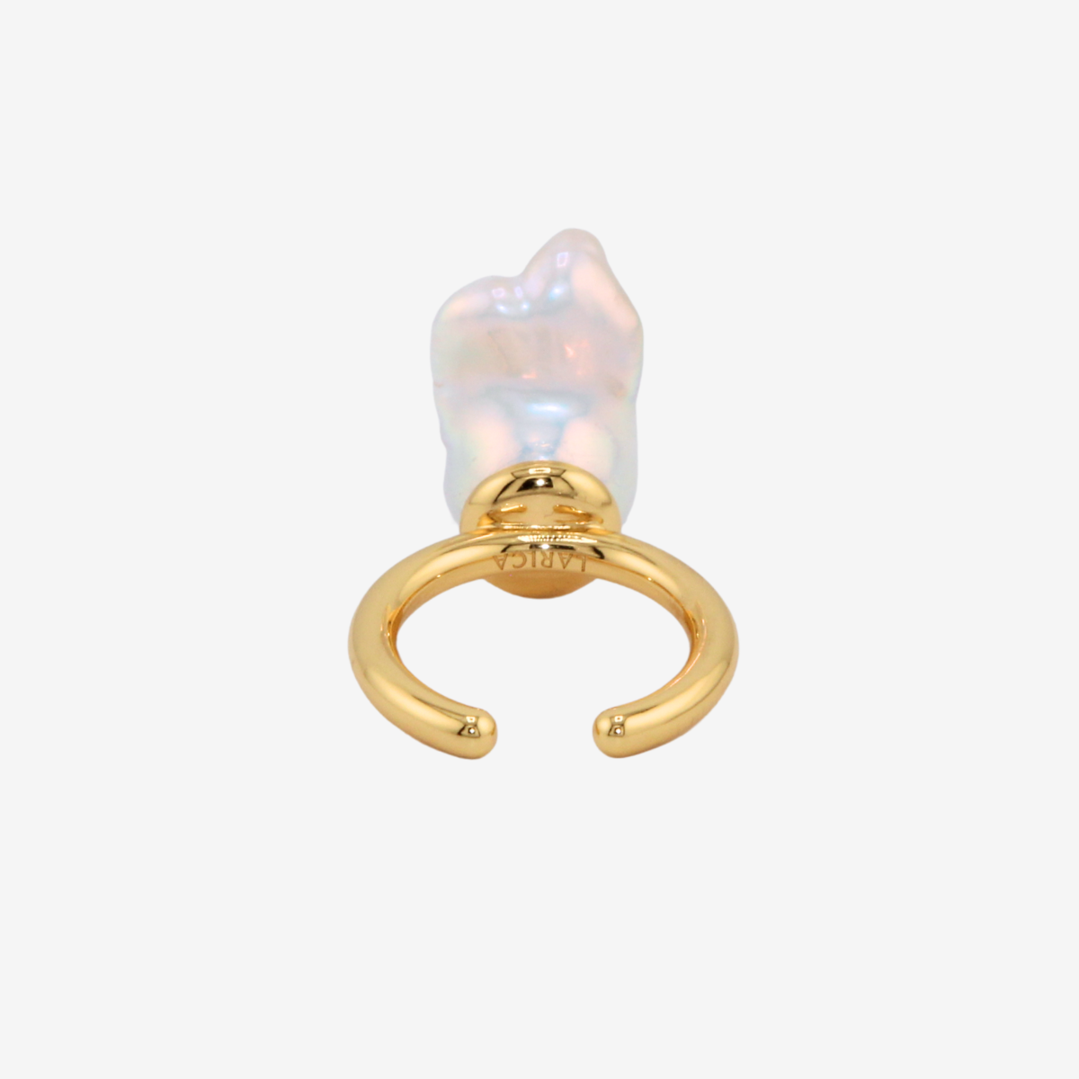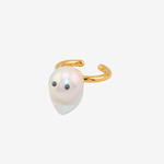 バロックパールにクリスタルの目をあしらった、LARICAのアイコン的存在「おばけちゃんリング」。ひとつひとつ表情の異なるバロックパールを使用し、思わず愛着が湧くような、ユーモラスで可憐なデザインに仕上げました。遊び心がありながらも、パールの艶とゴールドカラーが手元を上品に演出します。