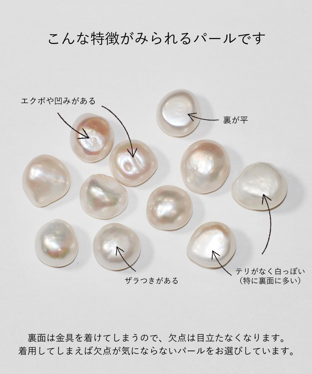 商品ページでは、一例として分かりやすいパールのクローズアップ写真を掲載しています。欠点が強調されて見えるかもしれませんが、実際に手に取るとバロックパール特有の強いテリが勝り、ほとんど気にならないものばかりです。初めてご覧になる方からは「どこが問題なの?」と驚かれることも少なくありません。